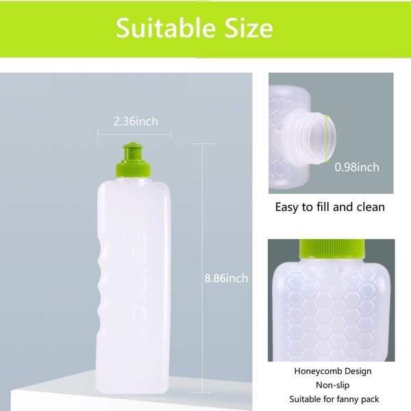 • ✅[Size]10oz (Up to 11oz) 9 x 2.5 x 2 inch; Compatibility with most Water Hydration Belts & Fanny Packs. Please check your fuel belt bottle bag size before purchase